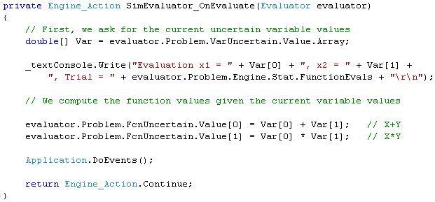 A portion of an example model in the C# programming language might look like this, where the array Var[] receives sample values for the two uncertain variables X and Y, and the uncertain function values are computed and assigned to the Problem's FcnUncertain object Value property: