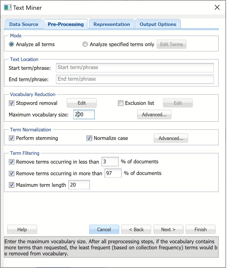 Enter 200 for Maximum Vocabulary Size. Text Miner will reduce the number of terms in the final vocabulary to the top 200 most frequently occurring in the collection.