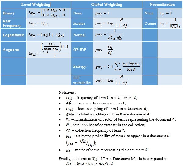 It’s also possible to create your own scheme by clicking the Advanced command button to open the Term Document Matrix – Advanced dialog. Here users can select their own choices for local weighting, global weighting, and normalization. Please see the table below for definitions regarding options for Term Frequency, Document Frequency and Normalization.