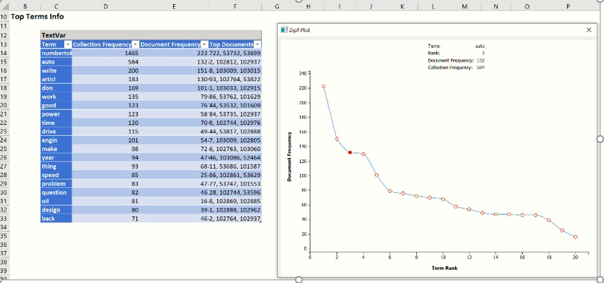 Keep Term frequency table selected (the default) under Preprocessing Summary and select Zipf’s plot. Increase the Most frequent terms to 20 and select Maximum corresponding documents. The Term frequency table will include the top 20 most frequently occurring terms. The first column, Collection Frequency, displays the number of times the term appears in the collection. The 2nd column, Document Frequency, displays the number of documents that include the term. The third column, Top Documents, displays the top 5 documents where the corresponding term appears the most frequently. The Zipf Plot graphs the document frequency against the term ranks in descending order of frequency.. Zipf’s law states that the frequency of terms used in a free-form text drops exponentially, i.e. that people tend to use a relatively small number of words extremely frequently and use a large number of words very rarely.