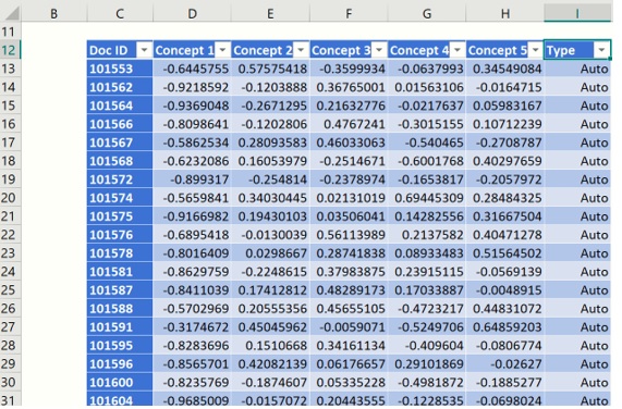 First, we’ll need to append a new column with the class that the document is currently assigned: electronics or autos. Since we sorted our documents at the beginning of the example starting with Autos, we can simply enter “Autos” into column I for Document IDs 101553 through 103096 (or cells I13:I162) and enter “Electronics” into column I for Document IDs 52434 through 53879 (or cells I163:I312). Give the column the title "Type".