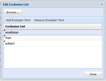 We could have also entered these terms into a text document (*.txt) and added the terms all at once by using the Browse button to navigate to the file and import the list. Terms in the text document can be separated by a space, a comma, or both. If, for example we were supplying excluded terms in a document rather than in the Edit Exclusion List dialog, we would enter the terms as: subject emailtoken from, or subject,emailtoken,from, or subject, emailtoken, from. If we had a large list of terms to be excluded, this would be the preferred way to enter the terms.