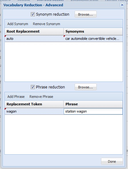 Text Miner allows the combining of synonyms and full phrases by clicking Advanced under Vocabulary Reduction. Select Synonym reduction at the top of the dialog to replace synonyms such as car, automobile, convertible, vehicle, sedan, coupe, subcompact, and jeep with auto. Click Add Synonym and replace rootterm with auto, then replace synonym list with car, automobile, convertible, vehicle, sedan, coupe (without the parenthesis). During pre-processing, XLMiner replaces the terms car, automobile, convertible, vehicle, sedan, coupe, subcompact, and jeep with the term auto. To remove a synonym from the list, highlight the term and click Remove Synonym.