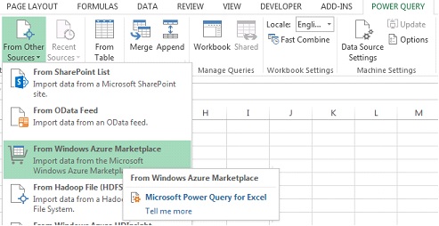 From here, start Microsoft Excel with a blank worksheet, and on the Excel ribbon, click the Power Query tab, then select From Other Sources, and select From Windows Azure Marketplace.