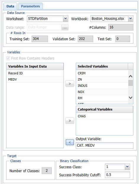 Analytic Solver Data Science includes the ability to partition a dataset from within a classification or prediction method by clicking Partition Data Parameters dialog. Analytic Solver Data Science will partition your dataset (according to the partition options you set) immediately before running the classification method. If partitioning has already occurred on the dataset, this option will be disabled. For more information on partitioning, please see the Data Science Partitioning chapter.