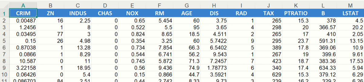 This example illustrates how to score new data using a stored model sheet using output from a Multiple Linear Regression fitted model. In other words, the fitted Linear Regression model from the Predicting Housing Prices using MLR will be used to predict values for the MEDV variable for 10 new housing tracts. The new dataset may be found below. This procedure may be repeated using any stored model sheets generated using Analytic Solver Data Science.