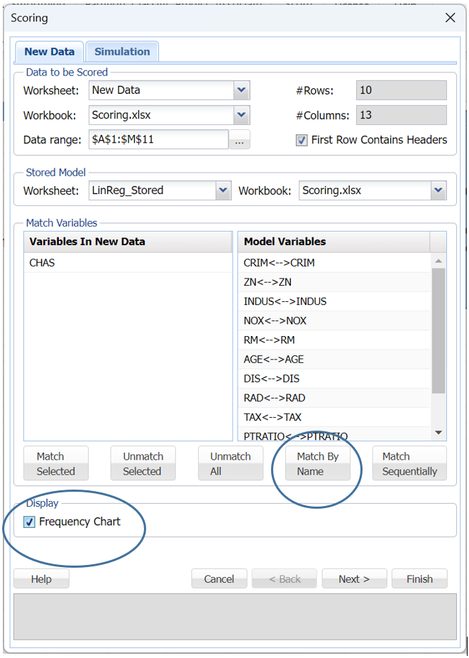 If Match By Name is clicked, all similar named variables in the stored model sheet will be matched with similar named variables in the new dataset.