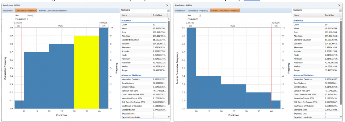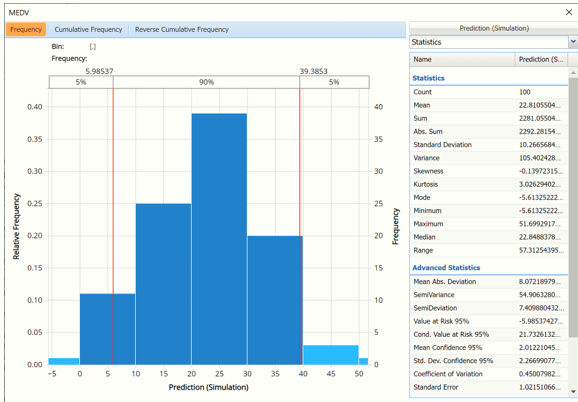 Red vertical lines appear at the 5% and 95% percentile values in all three charts (Frequency, Cumulative Frequency and Reverse Cumulative Frequency) effectively displaying the 90th confidence interval. The middle percentage is the percentage of all the variable values that lie within the ‘included’ area, i.e. the darker shaded area. The two percentages on each end are the percentage of all variable values that lie outside of the ‘included’ area or the “tails”. Percentile values can be altered by moving either red vertical line to the left or right.