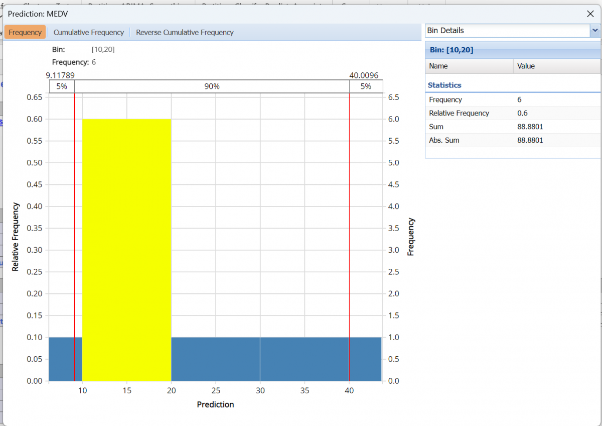 The first thing you’ll notice is the frequency chart that appears when the tab opens. This chart displays the frequency of the output variable, MEDV, for the new data dataset. Use the mouse to hover over any of the bars in the graph to populate the Bin and Frequency headings at the top of the chart.