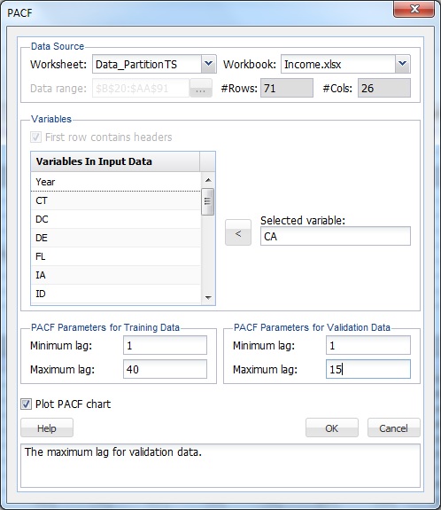 Open the Lag Analysis dialog by clicking ARIMA – Lag Analysis. Select CA under Variables in input data, then click > to move the variable to Selected variable. Enter 1 for Minimum Lag and 40 for Maximum Lag under Parameters: Training and 1 for Minimum Lag and 15 for Maximum Lag under Parameters: Validation.