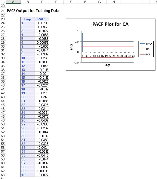 Analytic Solver has calculated the constant term and the AR1 term for our model, as seen above. These are the constant and f1 terms of our forecasting equation. See the following output of the Chi - square test.