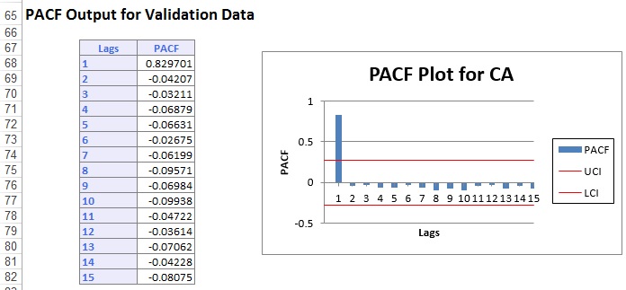 4. When a model is fit using the ARIMA method, XLMiner displays the ACF and PACF plots for residuals. If these plots are in the band of UCL and LCL, then the residuals are random and the model is adequate.