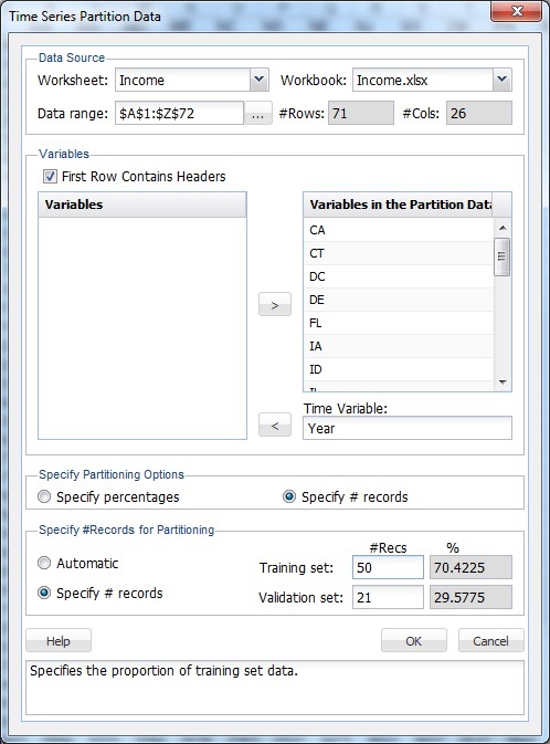 Select Year under Variables and click > to define the variable as the Time Variable.  Select the remaining variables under Variables and click > to include them in the partitioned data.
