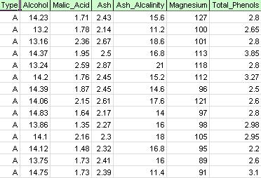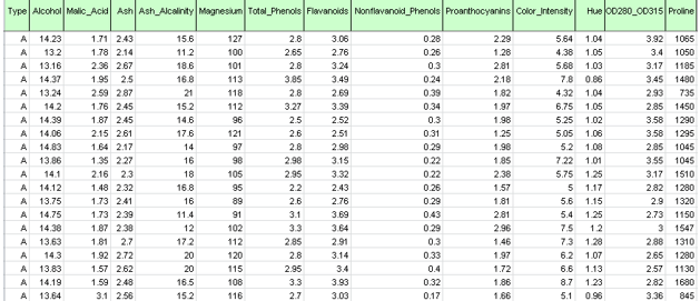 As shown in the figure below, each row in this dataset represents a sample of wine taken from one of three wineries (A, B or C). In this example, the Type variable representing the winery is ignored and clustering is performed simply on the basis of the properties of the wine samples (the remaining variables).