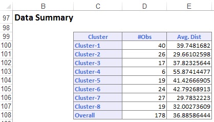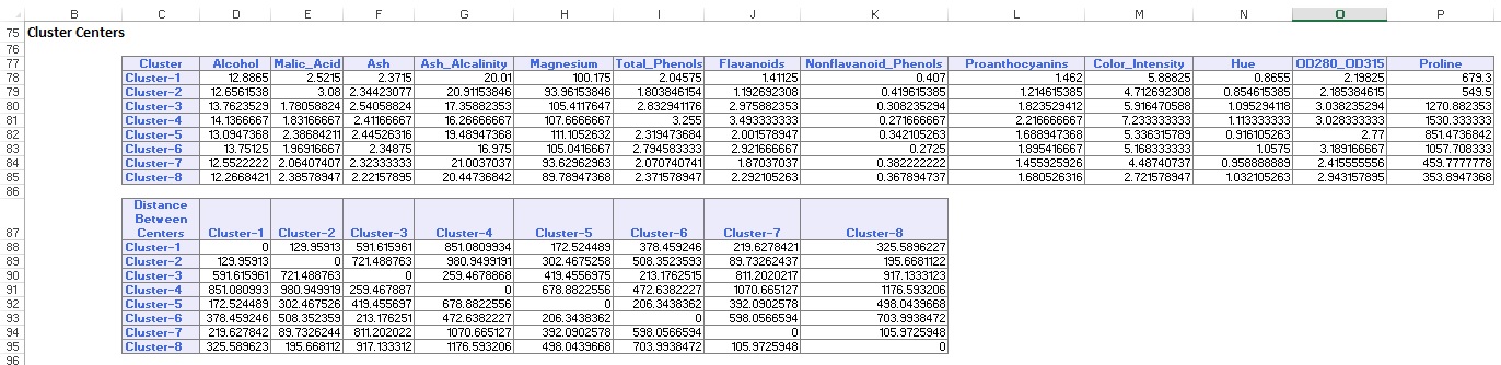 Scroll down on the KMC_Output worksheet to the "Cluster Centers" tables (shown below – click the Cluster Centers link in the Output Navigator to view), displays detailed information about the clusters formed by the k-Means Clustering algorithm: the final centroids and inter-cluster distances. If the input data was normalized, k-Means Clustering operates on rescaled data. Results are not transformed back to their original scale.