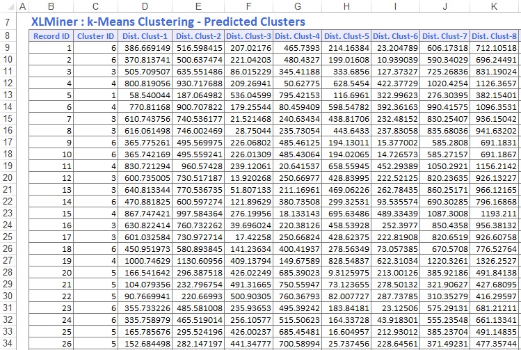 Click the KMC_TrainingClusters worksheet to view the Fitting Metrics for the training dataset and Cluster assignments for each record.