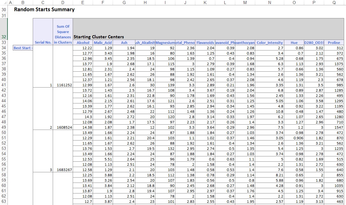 Increase #Starts to 5. The final result of the k-Means Clustering algorithm depends on the initial choice on the cluster centroids. The best assignment (based on Sum of Squared Distances) is chosen as an initialization for further k-Means iterations.
