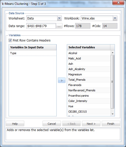 The example contained in this section uses the Wine.xlsx example file to demonstrate how to create a model using the k-Means Clustering algorithm.