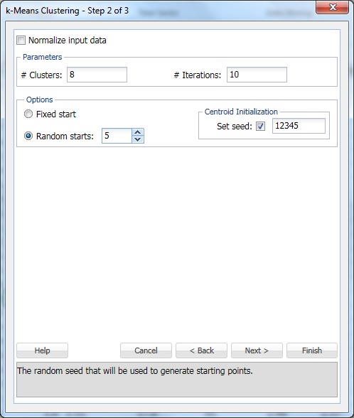 Random Seed is initialized to the default setting of “12345”. This option initializes the random number generator that is used to assign the initial cluster centroids. Setting the random number seed to a positive value ensures the reproducibility of the analysis.