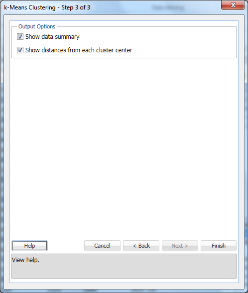 Leave Cluster Centers selected under Fitting and Fitting Metrics selected under Training Data. For more information on the remaining output options, see the k-Means Clustering Options section immediately following this example.