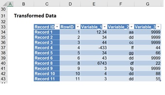 The Example 2 dataset is similar to the Example 1 dataset in that this dataset contains empty cells (cells B6 and D10), cells containing invalid formulas (B13, C8 & D4), cells containing non numeric characters (column C), etc. In this example we will see how the missing values in the Variable_1 and Variable_3 columns can be replaced by the Mean and Median, respectively.