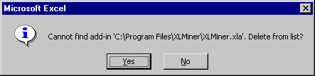If you uninstalled an earlier version of XLMiner which was registered as an Add-in, you will get the following error message as soon as you invoke Excel.