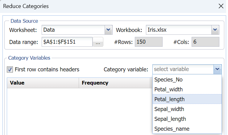 Open the Iris example dataset by clicking Help – Example Models – Forecasting-Data Science Examples. Select a cell within the dataset, say A1, then click Transform -- Transform Categorical Data – Reduce Categories in Desktop Analytic Solver or Transform – Categorical Data – Reduce Categories in the Cloud app to bring up the Reduce Categories dialog.