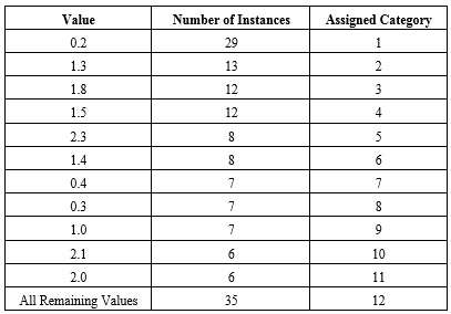 Incrementally increased category numbers are assigned to each value as the number of instances decreases until the 11th category is assigned. All remaining values are then lumped into the last category, 12.