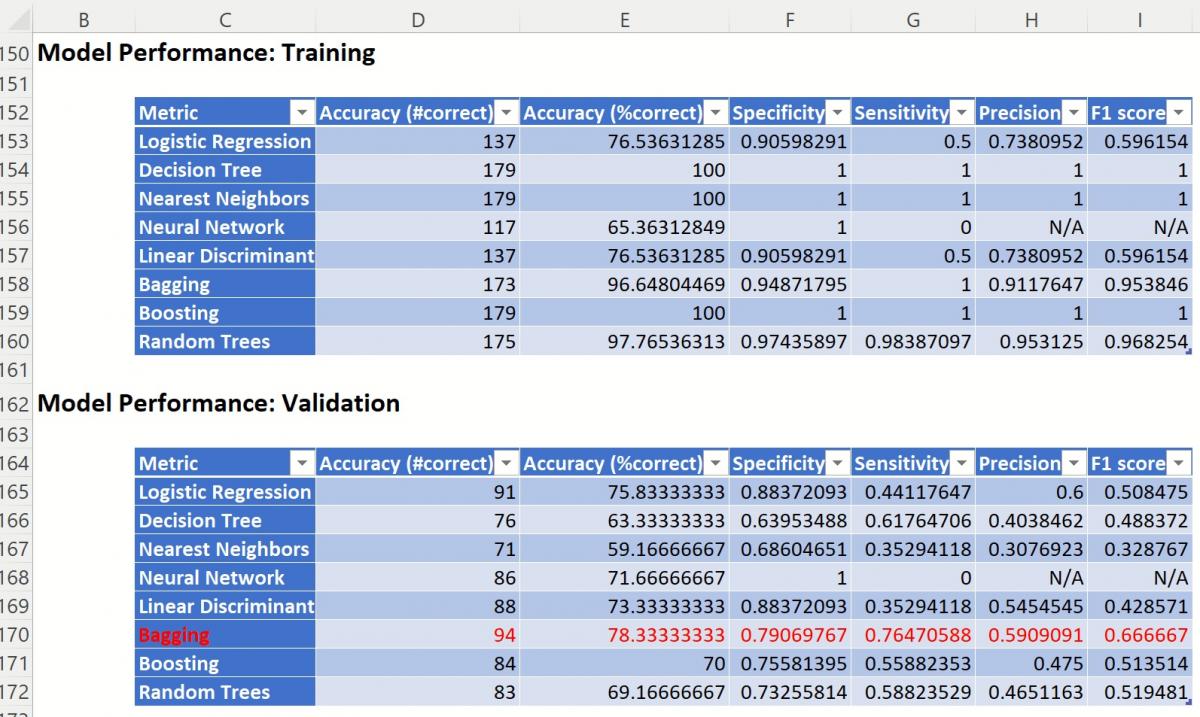 The %Error for the training partition was 21.67%. Most of the error is due to False Positives. The Bagging Ensemble misclassified 15% (18/120) of surviving patients as non-survivors and 6.7% of non-surviving patients as surviving (8/120).