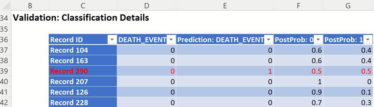 Classification Details: Individual records and their classifications are shown beneath Validation: Classification Details. Any misclassified records are highlighted in red.