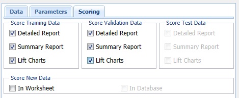 These options are enabled when a test data set is present. Select these options to show an assessment of the performance of the tree in classifying the test data. The report is displayed according to the specifications: Detailed, Summary, and Lift Charts. Lift Charts are only available when the Output Variable has two classes.